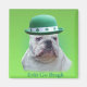 Das Bild zeigt ein weißer englischer Bulldogge, der eine grüne Derbey trägt, mit dem Text "Erin Go Bragh".