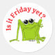 This cute little cartoon frog asks the age-old question, "Is it Friday yet?" Retro saying from the 1970's is back in vintage style! Design looks best on round or square stickers.