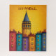 A vibrant city skyline featuring colorful buildings and a historic tower against a warm sunset background inspired by the city of Istanbul, Turkiye. This illustration is great for travelers of Istanbul, Turkiye.