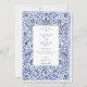 Mit dieser beeindruckend eleganten Einladung bringen Sie Ihre Gäste zur sonnigen Mittelmeerküste. Inspiriert durch klassische italienische Fliesen und Delft-blaue Töpferwaren, besticht dieses Design durch eine aufwändige, handbemalte Aquarellabgrenzung aus wirbelnden Blättern und Blumenmotiven. Eine reiche Palette von Blues, von tiefem Kobalt und Marine bis hin zu weichem Himmelblau, schafft einen schönen, dimensionalen Effekt vor einem knackigen, weißen Hintergrund. Ihre Hochzeitsdetails werden in der Mitte mit klassischer, raffinierter Typografie präsentiert, die das zeitlose und künstlerische Aussehen vervollständigt. Diese Einladung eignet sich perfekt für eine Hochzeit in Urlaubsort, ein klassisches Blau-Weiß-Motiv oder ein Paar, das ein verziertes und leicht schicker Design sucht.