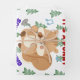 A cute and festive digital illustration featuring a chubby cartoon squirrel singing joyfully into a microphone. The squirrel is surrounded by blue musical notes, holding the mic with excitement. The text above and below reads "IT'S A FUNNY SQUEAKY SOUND" in bold red and purple font. The background consists of a repeating pattern of green sketched Christmas trees on a light grey backdrop, creating a humorous and holiday-themed design perfect for winter celebrations.