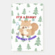 A cute and festive digital illustration featuring a chubby cartoon squirrel singing joyfully into a microphone. The squirrel is surrounded by blue musical notes, holding the mic with excitement. The text above and below reads "IT'S A FUNNY SQUEAKY SOUND" in bold red and purple font. The background consists of a repeating pattern of green sketched Christmas trees on a light grey backdrop, creating a humorous and holiday-themed design perfect for winter celebrations.