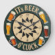 This is a round wall clock featuring the phrase "ITS BEER O'CLOCK" in light, three-dimensional block letters against a dark green, heavily distressed border. Six different beer glasses and mugs, all topped with foam, are illustrated around the circumference. The beige clock face features black star-like geometric shapes originating from the center. The distressed, rustic green finish gives the clock an antique appearance. The design may look real due to the high detail and three-dimensional texture in the artwork.