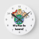 Three stick figure kids surround a world globe and text reads "It's Fun to Learn!" on school themed T-shirts, cards, mugs, stickers, buttons, and other gear!