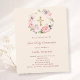 A soft ivory blush background, decorated with watercolored pink and white flowers in a wreath and a golden cross. Personalize and add a name and details.