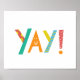 Moderne und skurrile Typografie in Grün, Blau, Rot und Orange mit dem Wort "Yay!". Design von Shelby Allison.