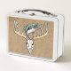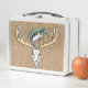 Largemouth Bass springt über großen antleren Hirschschädel mit Imitat Blatt Muster Hintergrunddesign. Von ©Tina Hesskew gezogene Bass- und Hirschhand.