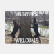 Diese Türmatte verfügt über ein Foto von zwei schwarz-bräunlichen Baumhunden Treeing und sagt HUNTERS WELCOME.