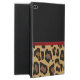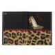 Stilvolle iPad Air-2-Gehäuse, mit eingebautem Ständer und Grafik eines gepunkteten braunen und schwarz gefärbten Jaguar-Pelzmusters, unten, oben mit einem schwarzen, massiven Schwarz. Die Grafik eines rot-satin aussehenden Farbbands verläuft in der Mitte und ein modisches Paar aus Jaguar-Druck-Stiletto-High-Heels schmückt die Vorderseite des Gehäuses. Personalisieren Sie den roten Text. Dies ist eine hervorragende Geschenkidee.