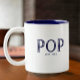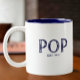 Pop Kaffee Tasse Design mit einem Jahr mit einem blauen Stempel Schriftart Set auf einem weißen Hintergrund. Klicken Sie auf Anpassen, um die Hintergrundfarbe zu bearbeiten!. Besuchen Sie unseren Shop, um diese Tasse in einem großen Sortiment von Großvaternamen zu sehen.