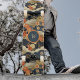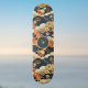 This vintage look skateboard features a Japanese style print -- similar to a kimono pattern -- with white, teal, tan, and orange flowers on dark teal-- almost black. Your monogram initial appears in gold text on a coordinated circle of dark blue teal, bordered by orange. The combination of clouds, graphical lines, stylized flowers, and curved pattern create a peaceful and beautiful aesthetic.