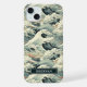 Make a statement with this iphone 15 plus phone case that features rolling Japanese waves in multiple shades of teal blue with splashes of earth tones. It's modern yet traditional. The pattern represents surges of good luck, peace, and eternal resilience. It becomes uniquely yours with your name in a CAP font in white on dark teal.