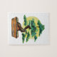 traditionelle Aquarellkunst eines kleinen Bonsai-Baumes, der aus einem braunen Topf vor einer großen goldenen Sonne als Puzzle wächst.