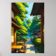 Ein ruhiges Café in Japan, umgeben von Bäumen.