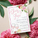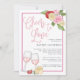 Elégante et moderne invitation à la douche nuptiale pour les amateurs de vin présente des accents de roses en rouge, jaune et rose avec un regard verdoyant sur la verdure, et deux verres clinquants de vin rosé. "Cheers to Love" apparaît en écriture manuscrite rose. Personnalisez avec vos détails de douche nuptiale dans une élégante typographie blush et gris-bleu, et customisez la bouteille de vin avec les initiales du couple. Cartes inversées aux rayures rose et blanc fuchsia.