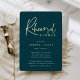 Die Probe des Hauses ist ein idealer Ausgangspunkt für Ausflüge in die Umgebung. Hier können Sie die wunderschöne Aussicht auf die Bucht genießen. Einfaches Design mit "Probe Dinner" in lässiger, handgeschriebener Schrift aus Goldfolie, mit den Details Ihrer Veranstaltung auf einem dunklen Juwel-Ton smaragdgrünen Hintergrund.