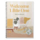 Ce carnet mignon illustre une pépinière au style moderne du milieu du siècle. La pépinière est dans les tons jaunes sans distinction de genre et comprend une chaise à bascule avec un lapin d'animal en peluche, un plante en pots de monstère et un lit d'enfant avec une couverture boho confortable. Il dit "Welcome Little One" dans grand texte serif moderne avec un spot pour customiser avec un nom ou un autre texte. Ce carnet fait un grand cadeau aux nouveaux parents.