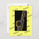 Jazz-Illustration. . ein Saxophon in Schwarz-Weiß mit goldenen Highlights und schwarzem Hintergrund auf gelber Matte mit dem Wort "Jazz". Ideal für Jazzliebhaber!