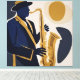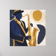 Feel the soul of jazz in this vibrant illustration. A musician with impeccable style, wearing a wide-brimmed hat and dark blue suit, brings a golden saxophone to life that seems to emit visual notes. The fluid shapes and warm color palette create an atmosphere of lively performance, capturing the cool and captivating essence of music in a single image.