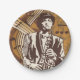 Ein Jazzmusiker spielt die Posaune mit einem Hut. Dieses Design wirkt auf diese Paper-Teller sehr effektiv