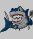 Bande dessinée drôle d'un requin avec les dents et la fourchette et le couteau énormes.