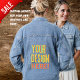 Einführung der ultimativen Personalisierten Denim Jacket: Beschreibung: Das ist nicht nur eine Jeans aus Denim; es ist eine Leinwand für Ihre Kreativität, ein tragbares Meisterwerk, das geboren gewartet wird. Unsere personalisierte Denim-Jacke ist ein zeitloses Kleiderheft mit einer modernen Drehung, das Ihren einzigartigen Stil, Ihre Erinnerungen oder Ihre Leidenschaft zeigen soll. Dieses klassische Stück wurde aus Premium Denim gefertigt und in eine Art Mode-Statement verwandelt, die Ihre Geschichte erzählt. Hauptmerkmale: Individuell anpassbare Leinwand: Die Denim-Jacke dient als leere Leinwand für Ihre Fantasie. Äußern Sie sich, indem Sie Text, Grafiken oder sogar Ihre eigenen Fotos hinzufügen. Egal, ob es Ihr Lieblingszitat ist, ein bedeutsames Datum oder eine geschätzte Erinnerung, Sie haben die Freiheit, jeden Zentimeter Ihrer Jacke zu personalisieren. Wer würde diese Jacke Liebe? Fashion Enthusiasten: Wenn Sie sich als jemand, der einzigartige Modeerklärungen und Lieben schätzt, von der Masse abzuheben, ist diese personalisierte Denim Jacke Ihr perfektes Spiel. Kreative: Künstler, Designer und jeder mit einem kreativen Flair kann diese Jacke in eine tragbare Leinwand verwandeln, um ihr Talent und ihre Vision zu zeigen. Paare: Feiern Sie Liebe und Zusammensein, indem Sie die passenden Jacken mit Ihrem Partner personalisieren. Zeigen Sie Ihre Namen, Termine oder unvergessliche Momente für einen stilvollen und sentimentalen Look. Event Goers: Auf dem Weg zu einem Musikfestival, Sportspiel oder zu jedem Event, bei dem Selbstausdruck gefeiert wird? Ihre personalisierte Denim-Jacke macht Sie zum Mittelpunkt der Aufmerksamkeit. Memorabilia Sammler: Gedenken Sie besondere Momente, Ausflüge oder Errungenschaften, indem Sie sie in tragbare Erinnerungen auf Ihrer Jacke verwandeln. Relevante Events: Musikfestivals: Stehen Sie bei Musikfestivals in der Menge auf, indem Sie eine personalisierte Denim-Jacke mit dem Logo oder den Texten Ihrer Lieblingsband tragen. Hochzeiten: Erstellen Sie personalisierte Jacken für Brautjungfrauen oder Trauzeugen, um Ihrem Hochzeitstag eine einzigartige Touch hinzuzufügen. Abschlüsse: Feiern Sie akademische Leistungen, indem Sie die Jacken mit Ihrem Abschluss Jahr, Schullogo oder einem unvergesslichen Zitat anpassen. Wiedersehen: Entwerfen Sie passende Jacken für Ihre Wiedersehen, damit Sie Ihren Clan leichter identifizieren und die Geschichte Ihrer Familie teilen können. Kunstausstellungen: Wenn Sie ein Künstler sind, der Ihr Werk präsentiert, kann eine personalisierte Jacke mit Ihrem Kunstwerk ein Konversationsstarter auf Kunstausstellungen sein. Entfesseln Sie Ihre Kreativität und tragen Sie Ihre Geschichte mit Stolz auf unsere personalisierte Denim-Jacke. Es ist nicht nur Kleidung, es ist ein tragbares Kunstwerk, das Ihre Individualität und Ihren Stil widerspiegelt. Machen Sie sich bereit, Kopf zu drehen und Gespräche zu entfachen, wo immer Sie hingehen!