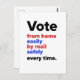 Das Voting per Mail hat viele Vorteile! Die Menschen brauchen vielleicht eine gewisse Ermutigung, um den Wechsel zu vollziehen, und einige Staaten verlangen von den Wählern, dass sie bei jeder Wahl eine E-Mail-Abstimmung beantragen. Diese Karte kann vor den Abstimmungsterminen und den Fristen für die Versendung der Stimmzettel verwendet werden, je nach Nachricht. Stellen Sie sicher, dass Sie die Menge in Ihrem Warenkorb Set haben, um genügend Karten zu bestellen, um durch Ihre Liste zu kommen!