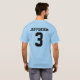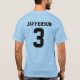 Thomas Jefferson trägt T-Stück mit Namen- und Zahlan Rückseite zur Schau