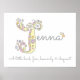 Jolie initiale J / art de monogramme personnalisé avec nom, affiche parfaite pour la chambre ou la salle de jeux d'une fille dans des tons de gris, blanc, jaune, rose et violet. Personnalisez avec le nom de votre enfant commençant par J, et la signification du nom pour un détail vraiment personnalisé dans la chambre ou la nurserie de votre enfant, cet exemple est pour le nom Jenna Un petit oiseau, juste, céleste et éloquent. Jolie impression d'affiche idéale pour un nouveau-né, un baptême ou un cadeau de baby shower. © Dessin de cœurs et de fleurs de monogramme J unique et conception graphique par Sarah Trett. www.sarahtrett.com pour www.mylittleeden.com