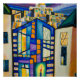 cubism painting of jerusalem with hanukkah candelabre in every doorstep or window.