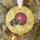 Der goldene Hintergrund dieses Ornaments, das Adam und den Garten Eden repräsentiert, hebt einen roten Apfel und eine schwarz-weiße Schlange hervor. Reverse ist goldgelb mit weißem geometrischem Schneeflockendesign.