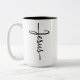 Coffee mug is shown in black and white with a Jesus Cross print.
