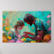 Dieses Poster zeigt Jesus als göttlichen Arzt, der ein junges Mädchen heilt. Er trug ein Kleidungsstück, das an aquamarine Schuppen erinnert. Jesus wird gezeigt, wie er einem jungen Mädchen mit großer Sorgfalt und Mitgefühl dient. Der allgemeine Ton des Bildes ist ein von Wärme, Zärtlichkeit und Hoffnung, betont die mitfühlende Natur von Jesus als Heiler und Betreuer.