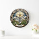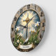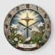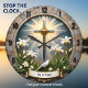 Celebrate the triumph of the resurrection with this high-energy and architecturally inspired wall clock. The central face features a high-definition graphic of a metallic-style cross radiating a brilliant golden sunburst against a serene sky. Elegant white lilies, a symbolic white dove, and a "he is risen" scroll complete the sacred scene. While the artwork masterfully mimics the textured look of hand-laid masonry in the outer rim and polished metal in the central cross, this is a lightweight and durable graphic timepiece rather than actual heavy stone or wrought iron. The bold black numeric markers are set against the realistic stone-effect border, providing a professional and polished contrast that makes the time easy to read. This timepiece serves as a sophisticated focal point for a living room, hallway, or prayer space, making it a meaningful self-gift for those who value spiritual art.