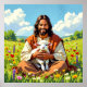 A Christian religious poster with an ai illustration of Jesus Christ holding a lamb and smiling. This poster will give you the emotional feeling of Jesus's love and compassion.