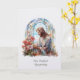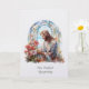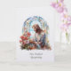 Diese elegante persönliche Beileidskarte zeigt ein ruhiges Bild aus Glasmalerei von unserem Herrn Jesus, der einen zarten Strauß Wildblumen bewundert. Die in sanften Pastellfarben von Blau, Weiß und Rosa gehaltene Kunst erweckt Frieden, Hoffnung und sanfte Erinnerung in Zeiten des Verlusts.