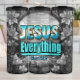 Dieses Bild zeigt ein kraftvolles spirituelles Deklarations-Set vor einem grauen Hintergrund. Eine zentrale Landschaft mit Wasser und einer weit entfernten Landschaft wird durch eine kunstvolle, blumengeschmückte Grenze gerahmt, die alle in Schwarz-Weiß-Tönen dargestellt ist. Der Text "JESUS Alles" ist in Blau und Gelb überlagert und vermittelt eine tiefe Botschaft der zentralen Bedeutung Jesu im Leben.
