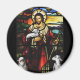 Vintage Buntglaskunst, die Christus als Hirte mit seinen Lämmern darstellt.
