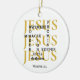 Personalisiertes JESUS Waymaker Christliches Ornament mit KUNDENBARE TEXT, entworfen mit einigen der beliebten Beschreibungen des Lord JESUS in einem Kreuzworträtformat in fett schwarzer Typografie. Im Hintergrund wird der Name Jesu dreimal in goldfarbenem Serif-Schriftart wiederholt. Unter dem Design befindet sich der Platzhaltername, der anpassbar ist, sodass Sie Ihren Namen und Ihren Initial hinzufügen oder Ihren eigenen Text erstellen können. Dieser Jesus-Ornament würde ein großes Geschenk für Geburtstage, Weihnachten und für jeden, der die folgenden inspirierenden Zitate auf der Grundlage der Bibelschrift Liebe: Gott wird einen Weg in die Wüste machen; Gott behalte immer seine Versprechen; Jesus ist das Licht der Welt, und Gott ist einer, der Wunder vollbringt. Wählen Sie aus einer breiten Auswahl inspirierender Zitate zu Geschenken, die von #bereandesigns entworfen wurden