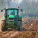 Préparation pour le next crop. The tractor plows (ploughs) the field and wild birds look for food in the freshly turned soil. Watercolor England.