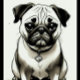Illustration aquarelle d'un chiot carlin assis devant les cartes à jouer, les cartes sont le Roi des Diamants, Jack des Clubs, Reine des Coeurs, et Roi des Pique, le carlin porte un collier avec une étiquette en forme de coeur, le style rappelle les illustrations de livres pour enfants, avec un éclairage doux et diffus et un schéma de couleurs monochromatiques.