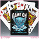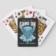 Faites monter votre jeu de poker avec ces cartes à jouer uniques qui présentent une illustration de style gothique d'un squelette avec des ailes reposant sur des nuages tourbillonnants rendus dans des tons bleus vibrants sur un fond noir dramatique avec des accents d'étoiles pour une esthétique sombre. Une typographie en gras qui dit « Faites monter votre jeu » et « Jouez ou périssez » crée une ambiance sombre et audacieuse. Quatre espaces personnalisables vous permettent d'ajouter vos initiales, l'année en cours, ainsi que du texte supplémentaire en haut et en bas du design pour créer un jeu de cartes qui vous est propre ou un cadeau personnalisé attentionné. Parfait pour les soirées poker, les collectionneurs de cartes, les amateurs d'art gothique ou quiconque adopte un design sombre et tendance, ces cartes à jouer allient attitude, créativité et personnalisation en un jeu ino