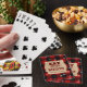 Ces cartes à jouer personnalisées ont un thème festif de Noël. L'arrière - plan dispose d'un motif de plaid de Buffalo rouge rustique parsemé de flocons de neige. Une affiche vintage en papier parchemin est imprimée au centre et encadrée d'une bordure en feuille d'or. L'expression "Mangez Boire et Soyez Joyeux" est imprimée en haut dans une police rouge bordeaux, suivie d'un exemple de nom de famille. Vous pouvez personnaliser les cartes pour inclure votre propre nom personnalisé ou un autre texte.