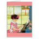 Petite fille mignonne dans la robe rose se reposant sur un banc de piano jouant le piano. Le piano est placé devant une grande fenêtre. C'est une illustration vintage du début du 20ème siècle.