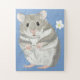 Dieses hübsche Puzzle für Kinder besticht durch einen niedlichen, flauschigen, grauen und weißen Hamster mit einer Blume vor blauem Hintergrund.