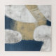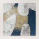 Eine große abstrakte Form in marineblau bedeckt den Rand der Leinwand bis zum Rand, wobei Ausschnitte einen texturierten, weißen Hintergrund ergeben. Ein abgenutzter, strukturierter beigefarbener Bereich sitzt über der blauen Form, weiße Linien Drehung wie Seil in einem dynamischen Finish zum Stück.
