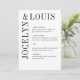 Modernes Hochzeitsmenü in minimalistischem Schwarz-Weiß-Design mit Ihren Namen in einem großen Schriftart entlang der links Seite und oben. Dieses Design ist einfach genug für eine feierliche Hochzeit, aber macht eine kühne Aussage.