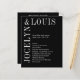 Programme de mariage moderne avec un design noir minimaliste avec vos noms dans une grande police le long du côté gauche et du dessus. Cette conception est assez simple pour un mariage officiel tout en faisant une déclaration audacieuse.