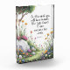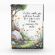 In einem skurrilen Fantasiegarten führt ein kurvenreicher Weg durch lebendige Blüten. Die Inschrift von John 16:33: "In dieser Welt wirst du Schwierigkeiten haben. Aber Herz! Ich habe die Welt überwunden." Das Bild lädt die Besucher zum Nachdenken ein und erinnert sie daran, dass Herausforderungen Teil der Reise sind, selbst in einem Bereich des Staunens, aber Hoffnung herrscht.
