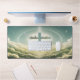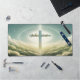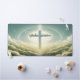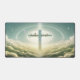 Croix bleue douce parmi des nuages fluides avec design typographique.